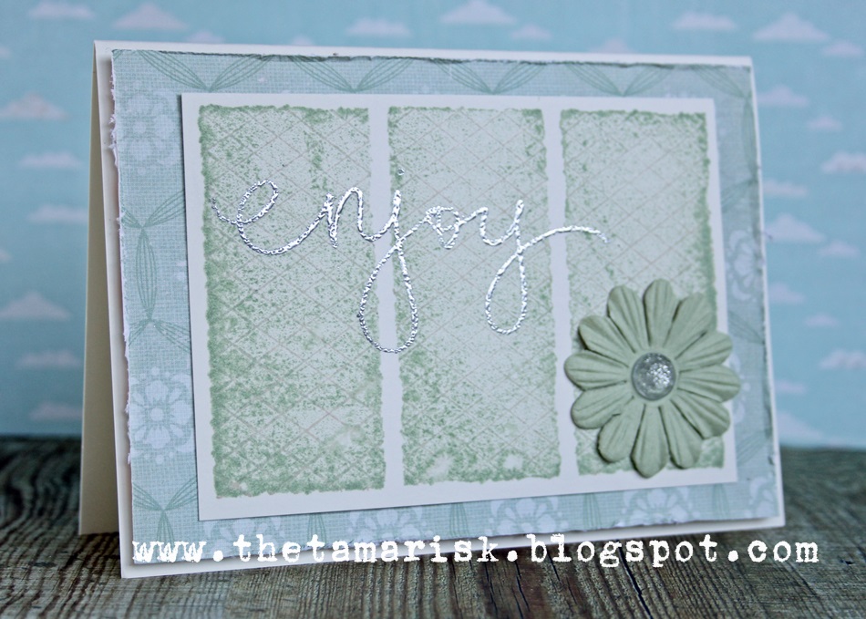 For this first card I inked the Shadow stamp up with Bundled Sage ink, and then stamped the Criss Cross Background into it with Pumice Stone: